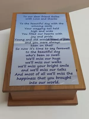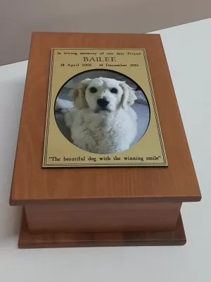 With 5 sizes available we have no difficulty providing a final resting place for small pets such as guinea pigs, to the largest of dogs - the great dane. We can also custom make urns to fit larger stock such as alpaca and horses, and our turn around time is speedy.